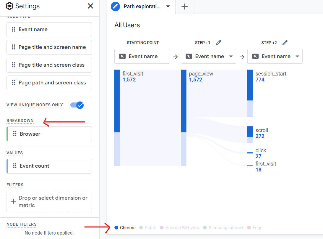- Nodes: Nodes are the data points for a given step in a path exploration. You get four nodes in GA4 – event name, page title and screen name, page title and screen class, and page path and screen class. When you select an event name, nodes signify the total number of events triggered by users. However, if you choose the other three options, the node equals the total number of users.