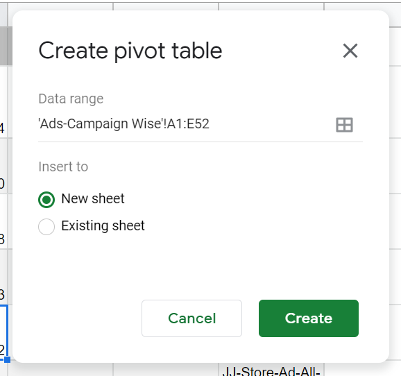 3. Choose where you want to add the pivot table and click on ‘Create’