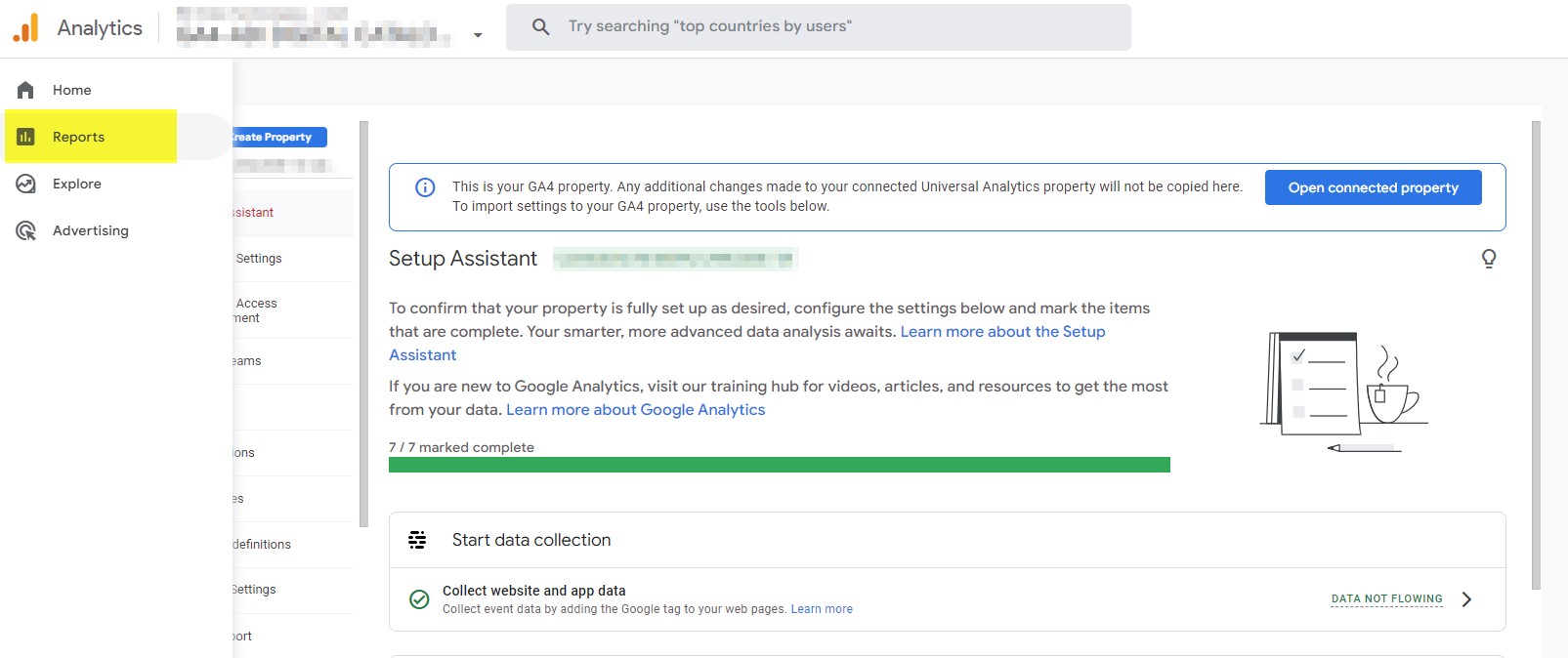 I'm not very tech-savvy, so I allowed the transition from Universal Analytics to GA4 to occur automatically. When I access Analytics, it redirects me to the "GA4 Property Set Assistant." I click on "Go To Your GA4 Property," which then takes me to the Setup Assistant. Here, it indicates that my property is connected and shows that I have completed 7 out of 7 steps.